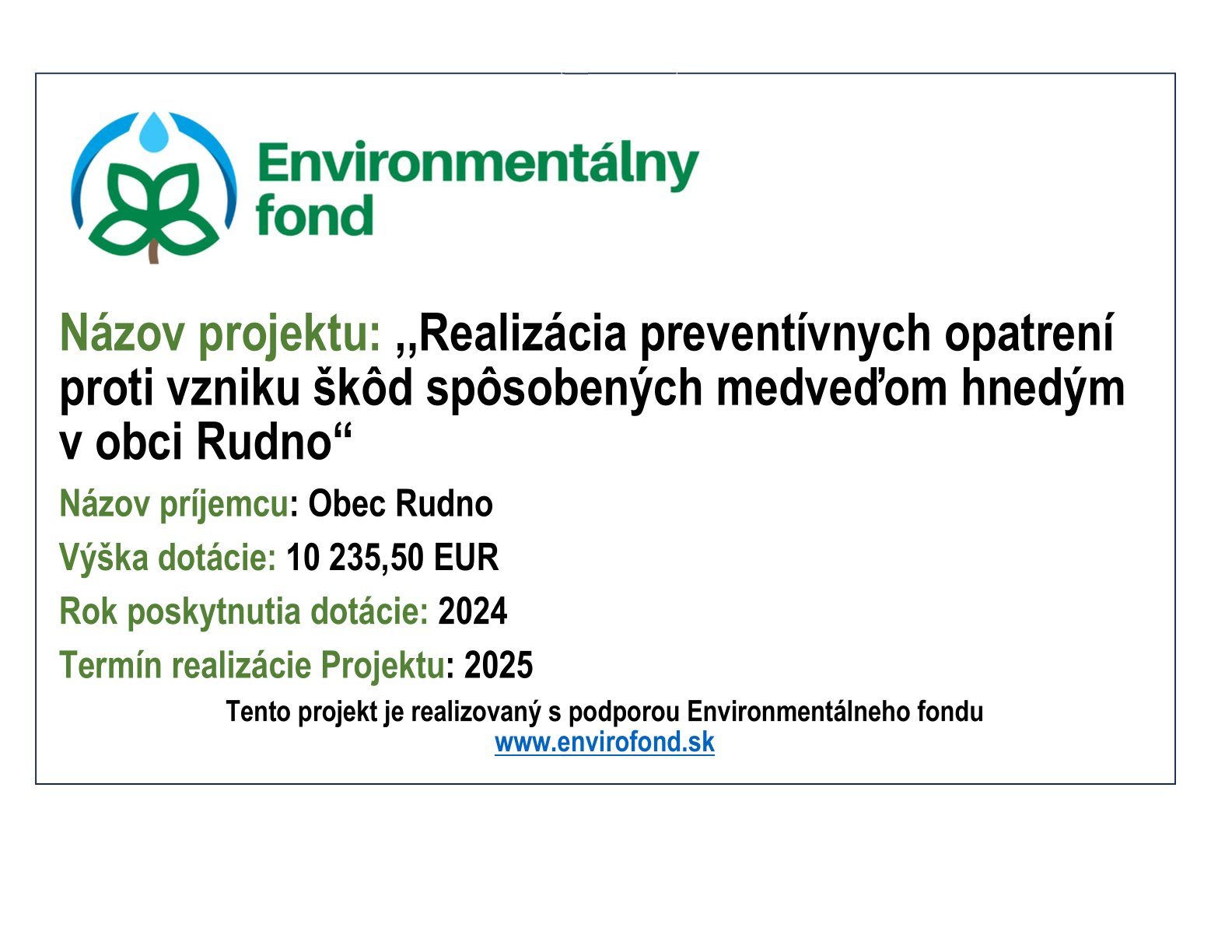 Názov projektu: Realizácia preventívnych opatrení proti vzniku škôd spôsobených medveďom hnedým v obci Rudno