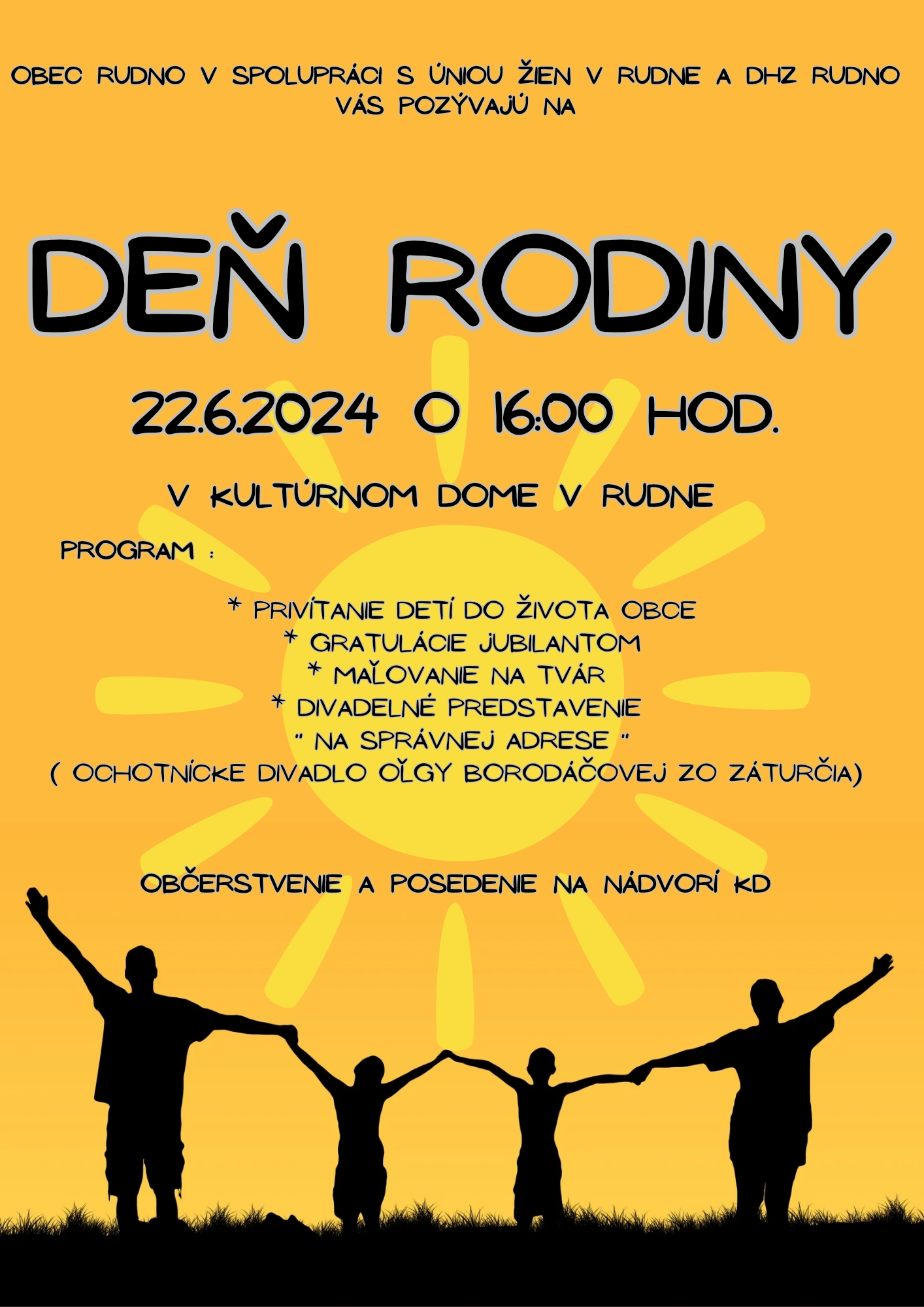 | Doplňujúce informácie | Obec Rudno Vás srdečne pozýva na DEŇ RODINY v sobotu 22.6.2024 o 16.00 hod do Kultúrneho domu. |